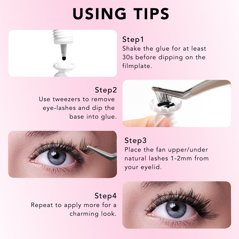 Postopek aplikacije je hiter in enostaven. Začnite z izbiro želenih grozdov za trepalnice in jih položite na ravno površino. Nato na dno vsake grozde nanesite majhno količino našega samostojnega lepljenja. Pustite, da se lepilo za ploščo za trepalnice nekaj sekund posuši, nato pa grozde nežno pritisnite na vaše naravne trepalnice.